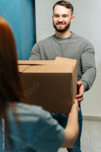 Vertical shot of smiling bearded courier male delivering cardboard box parcel to female customer on doorway at home. Unrecognizable young woman client receiving parcel package post from delivery man.