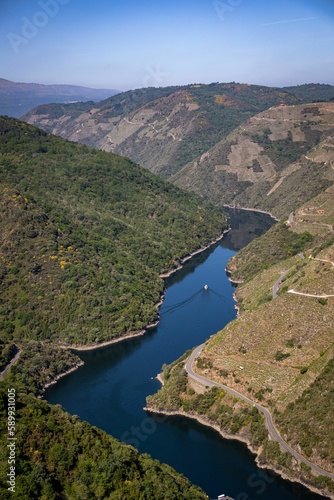 Vertical shot of the river surounded by the mountains on a sunny day