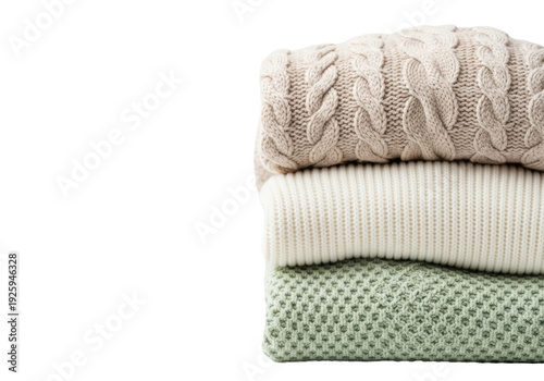 vertical stack of four folded, thick wool and cashmere sweaters (beige, off-white, sage) showing intricate textures, against a transparent studio background with ample copy space, concept of