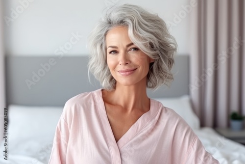 Very attractive mature women posing sitting at her bedroom looking at the camera. Generative AI