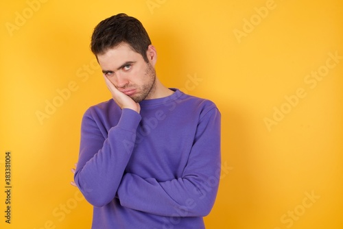 Very bored Handsome man with sweatshirt over isolated yellow background holding hand on cheek while support it with another crossed hand, looking tired and sick,
