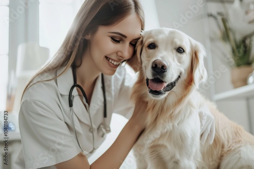 Veterinarian on a checkup visit in a modern veterinary clinic with an attentive and happy doctor. Generative AI
