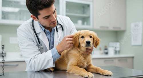 Veterinarian treating a happy dog in clinic with care and attention. Generative AI