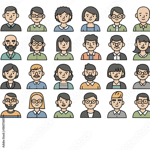 people, person, avatar, icon, set, collection, user, profile, character, head, face, portrait, bust, head shot, illustration, graphic, cartoon, drawing, flat, design, simple, outline, colourful, diverse, diversity, group, team, community, man, woman, male, female, man, woman, adult, senior, young, old, human, individual, employee, staff, client, client, business