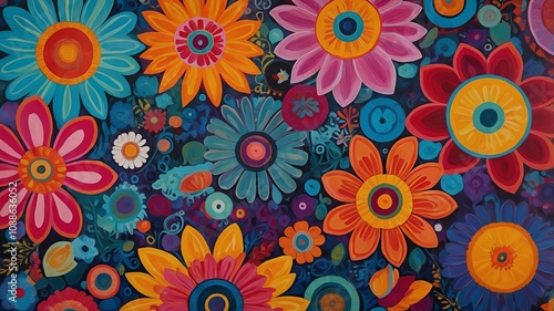 Vibrant abstract circular flowers in red, blue, and yellow hues with lush green leaves on a dark background