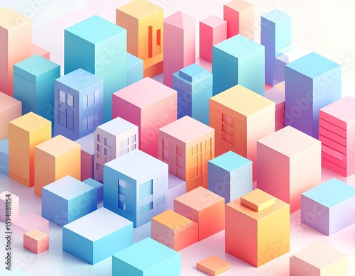 Vibrant abstract cityscape with colorful geometric buildings in pastel tones