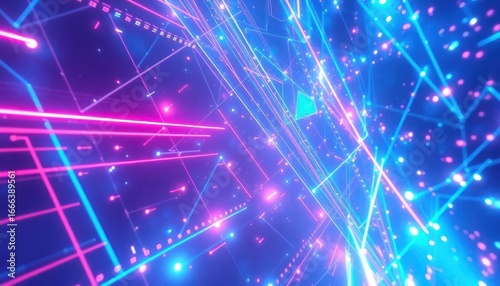 Vibrant abstract digital network with glowing neon lines and connections, representing data flow, internet, and modern technology. Ideal for business, tech, and futuristic concepts.