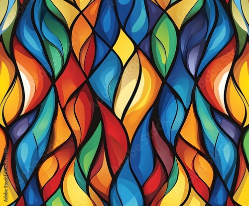 Vibrant abstract illustration of flowing shapes resembling a colorful stained glass window or a kaleidoscope of light