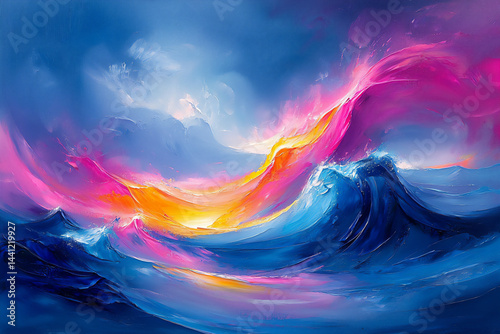 vibrant abstract painting with swirling lines of electric blue, neon pink, and bright yellow