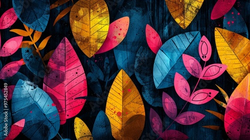 Vibrant abstract pattern with colorful leaves on a dark background. A modern and artistic design for various projects.
