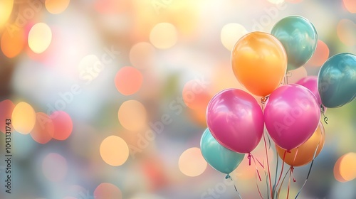Vibrant and Cheerful Balloons Floating Against a Defocused Background of Festive Lights and Bokeh,Capturing the Joyful Atmosphere of a Celebratory Event or Party