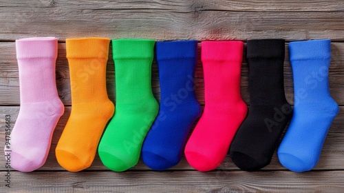 Vibrant and Colorful Socks Arranged in a Row on a Rustic Wooden Background