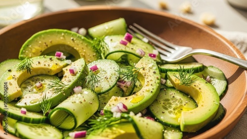avocado, cucumber, salad, healthy, fresh, vegan, green, light, meal, organic, dill, onion, pepper, oil, alimentary, wholesome, vegetarian, diet, food, cookery, summer, side, snack, crisp, vibrant, delicious, rustic, wood, bowl, fork, dressing, clean, eating, natural, produce, raw, savoury, homemade, well-being, lifestyle, detox, macro