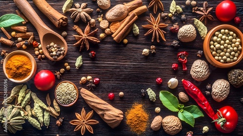 Vibrant Aromatic Spices Frame on Dark Wood Background