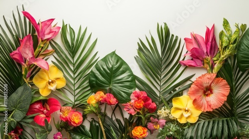 Vibrant arrangement of colorful tropical flowers and lush green leaves on a white background, ideal for botanical themes, floral design, and nature-inspired decor. Tropical, floral, leaves, compositio