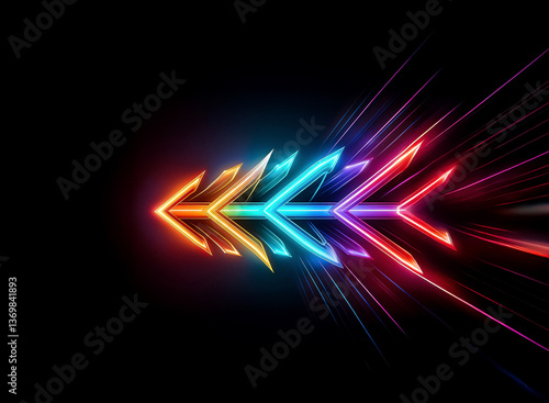 Vibrant arrow of light streaks across a dark void, displaying a spectrum of colors from orange to red, creating a sense of motion and direction.