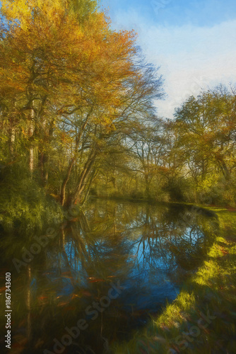 Vibrant autumn digital illustration of tree and leaf colours along the Leek branch of the Caldon canal inland waterway in Staffordshire, England, UK.