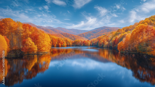 Vibrant autumn leaves reflect on calm lake with mountains in backdrop. Clear blue sky enhances serene atmosphere. Concept of nature tourism, outdoor adventures, scenic photography