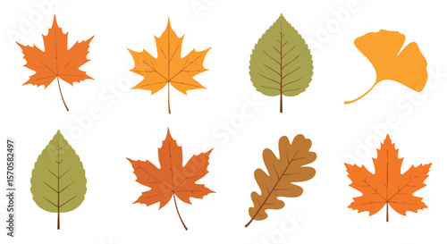 leaf, leaf, autumn, fall, foliage, nature, vector, illustration, set, collection, seasonal, maple, oak, ginkgo, birch, plant, tree, organic, natural, graphic, element, design, isolated, white, background, brown, orange, yellow, green, gold, rust, harvest, botany, flora, simple, flat, decor, change, vibrant, environment