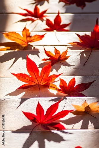 autumn, leaf, maple, red leaf, orange leaf, fall, nature, foliage, red, orange, yellow, step, sunlight, shadow, autumn leaf, fall leaf, maple leaf, vibrant, colourful, seasonal, background, texture, bright, sun, light, autumn, autumn color, season, still life, photo, image, red maple, fall foliage, autumn scene, white, staircase
