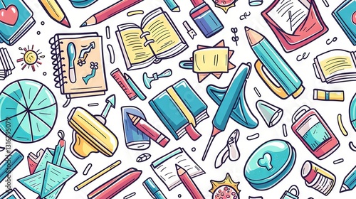 Vibrant back to school doodle seamless pattern featuring hand-drawn supplies and playful academic elements in a creative vector design.