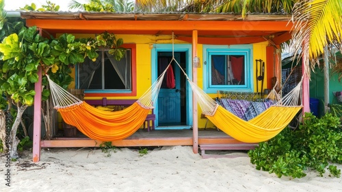Vibrant beach house with hammocks idyllic summer vacation scene