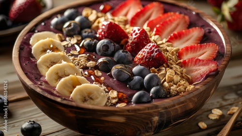 smoothie, bowl, berry, banana, blueberry, strawberry, granola, healthy, breakfast, fruit, wooden, table, colourful, vibrant, fresh, alimentary, delicious, garnish, food, meal, cookery, nutrient, tasty, refreshing, morning, vegetarian, organic, natural, nourishment, blend, vitamin, fiber, grain, wholesome, texture, taste, ingredient, decorative, appetising, diet, snack, epicure, artisanal, wood, rustic