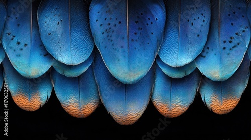 feather, blue, bird, texture, pattern, background, nature, wildlife, animal, detail, macro, closeup, plumage, wing, colourful, vibrant, exotic, tropical, abstract, design, art, graphic, illustration, ornament, decoration, beauty, elegant, smooth, glossy, bright, dark, shadow, row, arrangement, overlay, seamless, repeat, image, photo, picture, avian, fauna, scale