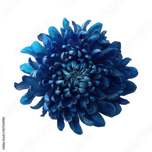 flower, blue, chrysanthemum, bloom, floral, blossom, flower petals, botany, nature, plant, dark blue, high-coloured, vibrant, closeup, macro, isolated, studio shot, single flower, dark background, detailed, texture, design element, decoration, aesthetic, beautiful, elegant, serene, calm, still life, botanical, photo, image, picture, illustration, art, design, graphic, visual, element, shape, round, radial, symmetric, pattern, colours, hue, tone