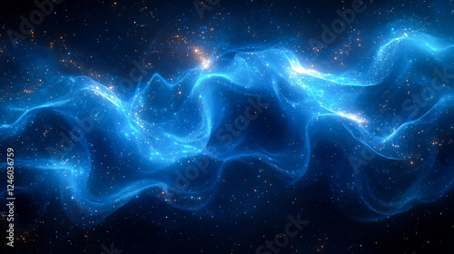 Vibrant blue cosmic nebula with golden stars. Abstract galaxy background, dynamic energy flow, futuristic light texture. Science, tech, design, wallpaper, space.
