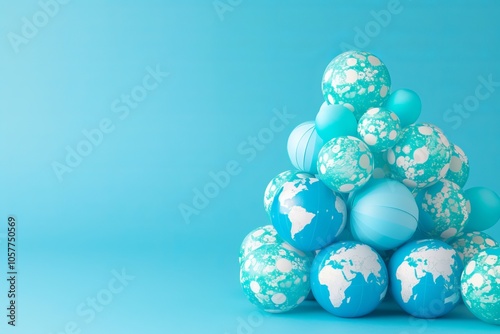 Vibrant blue globe balloons on aquatic background symbolizing global unity and creativity. Concept of blue Monday