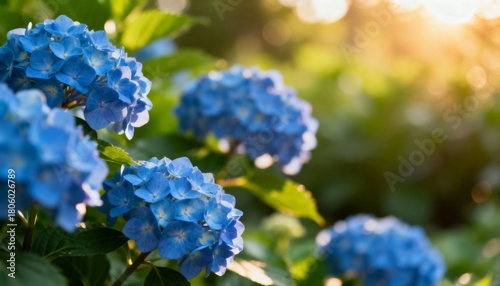 Vibrant blue hydrangea blossom in soft golden sunlight, macro detail, serene summer garden bokeh, natural beauty, floral backdrop