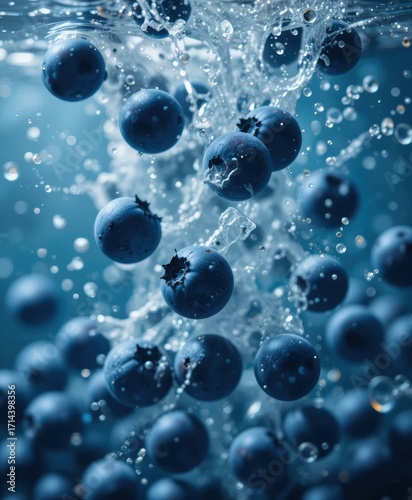 Vibrant Blueberries Cascading into Refreshing Water, Creating an Energetic Splash and Capturing the Essence of Freshness and Healthy Nutrition