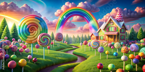 lollipop, rainbow, landscape, colourful, whimsical, house, tree, sweet, vibrant, fantasy, pathway, sky, cloud, green, playful, cheerful, nature, bright, magical, scenery, fun, joyful, artistic