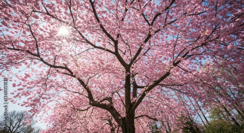 Vibrant cherry blossom tree in full bloom under a bright sun in a serene park setting