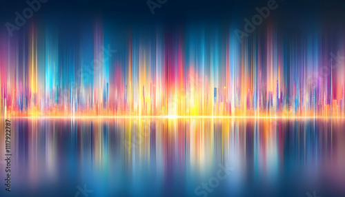 Vibrant city skyline reflected in calm water, showcasing dynamic light streaks and futuristic architecture. Ideal for tech, design, and urban themes.