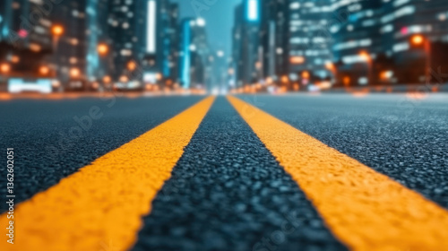 vibrant city street at night showcases smooth asphalt road with bright yellow lines, surrounded by towering buildings illuminated by city lights, creating lively urban atmosphere