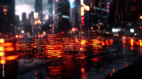city, night, rain, neon, light, street, urban, coin, vibrant, atmosphere, glow, wet, skyline, modern, architecture, travel, scenery, nightlife, bustling, energy, illumination, texture, depth, contrast, colours, dynamic, urbanity, mood, visual, design, aesthetic, beauty, landscape, photo, environment, scene, ambience, motion, urbanisation, element, detail, artistic, captivating, composition, creative, inspiration, storytelling