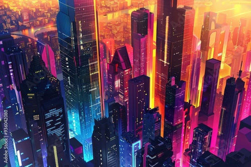 city, city landscape, night, neon, light, skyscraper, building, tower, illuminated, urban, modern, futuristic, architecture, window, glasses, concrete, steel, glow, vibrant, colourful, abstract, digital, art, design, graphic, illustration, background, texture, pattern, perspective, aerial, view, high, rise, sky, cloud, horizon, sunset, dusk, evening, dark, shadow, detail, contrast, high-coloured, bright, dynamic