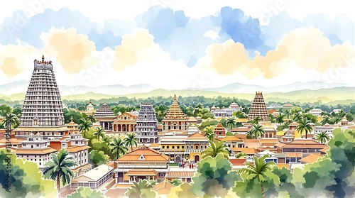 Vibrant cityscape featuring several intricately designed temples with towering gopurams, surrounded by lush greenery and mountains in the background, showcasing the architectural beauty and cultural