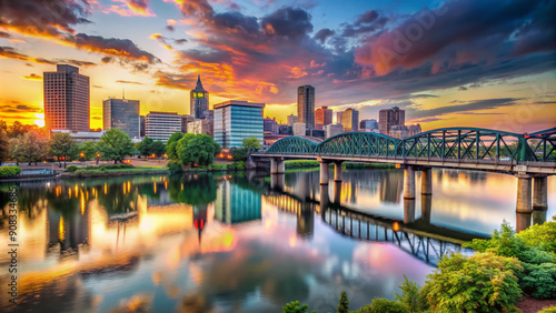 Vibrant cityscape of Portland's Willamette River waterfront at sunset, with steel bridges, lush greenery, and modern buildings reflecting in calm waters.