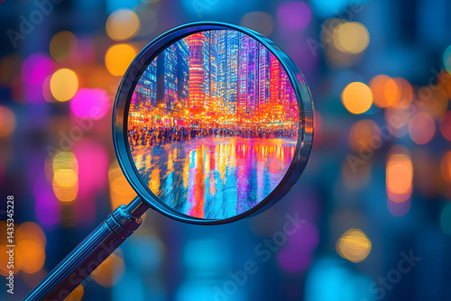 city landscape, reflections, magnifying, urban, nightlife, vibrant, colourful, skyscraper, bokeh, light, night, energy, modern, magnifier, glasses, photo, architecture, city, high-coloured, blur, detail, sharpened, illumination, metropolis, downtown, conceptual, closeup, artistic, dynamic, surreal, neon, glowing, exploration, perspective, futuristic, abstract, lighting, composition, skyline, bustling, atmosphere, creative, bright
