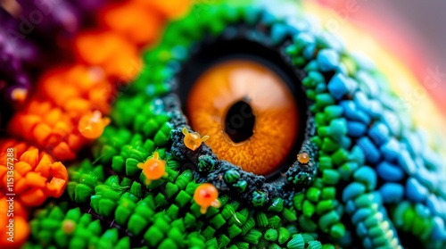 Vibrant close-up of an artistic eye crafted with colorful beads, showcasing intricate detail and texture.