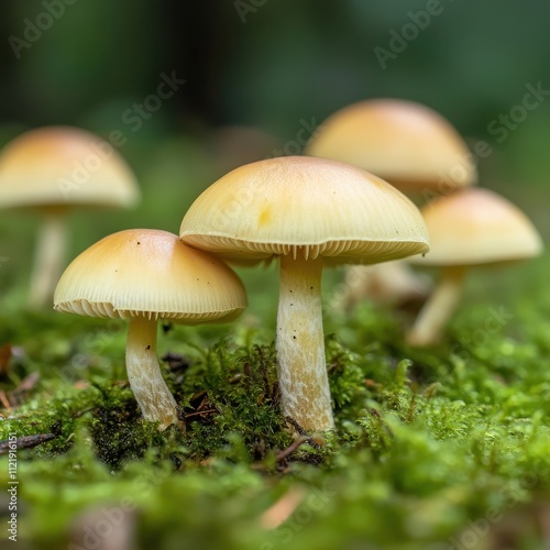 Vibrant Close-Up of Mushrooms Growing on Forest Floor Surrounded by Lush Green Moss in Natural Light, Capturing the Beauty of Fungi in Nature
