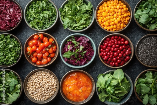 Vibrant Collection Of Fresh Healthy Vegetables And Ingredients In Bowls On Dark Surface, Emphasizing Nutrition And Plant-Based Eating For Optimal Health