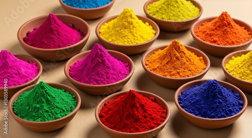 Vibrant colored powders in decorative bowls displaying a festive mood and representing traditional celebrations with a neutral background