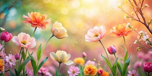 Vibrant colorful blooms unfolding in a delicate watercolor style on a soft peach background, garden scene, spring flowers