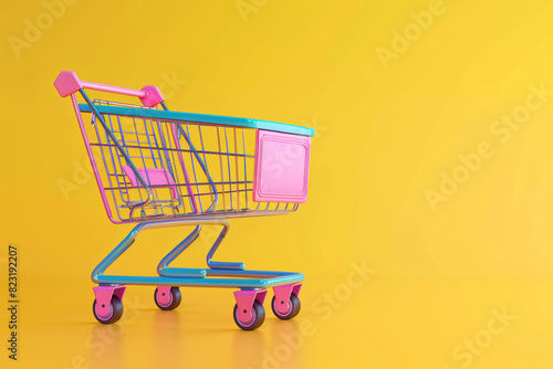 vibrant, colourful, shopping cart, empty, yellow background, closeup, simple, pink, yellow, blue, sleek, bright, e-business, online shopping, retail, consumerism, market, buying, purchase, sale, commerce, business, shop, buy, sell, merchandise, commercial