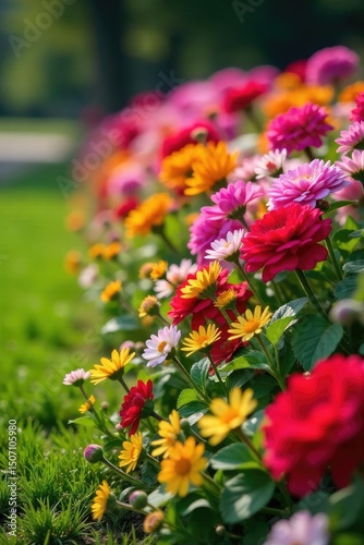 Vibrant, colorful flowers blooming profusely along a garden border, creating a stunning natural edge Perfect for landscaping, gardening, and springtime themes , bright, spring, design
