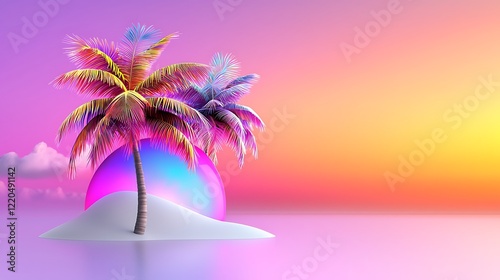 palm, tree, sunset, tropical, beach, ocean, island, digital, art, pixel, neon, colourful, vibrant, gradient, pink, purple, blue, orange, yellow, holographic, fantasy, surreal, abstract, illustration, artwork, design, graphic, modern, minimal, summer, vacation, paradise, escape, dreamy, whimsical, peaceful, serene, calm, relaxing, beautiful, aesthetic, artistic, creative, style, scene, landscape, seascape, horizon, sky